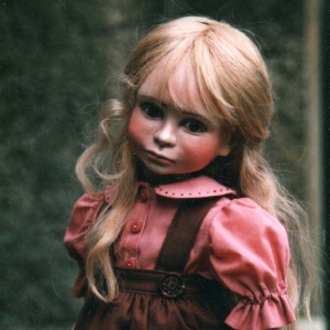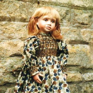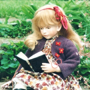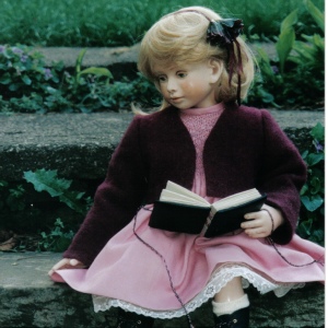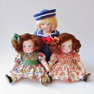 Nostalgic girls, with painted eyes, human hair wigs, and a hand tailored clothing. Around 19” tall.